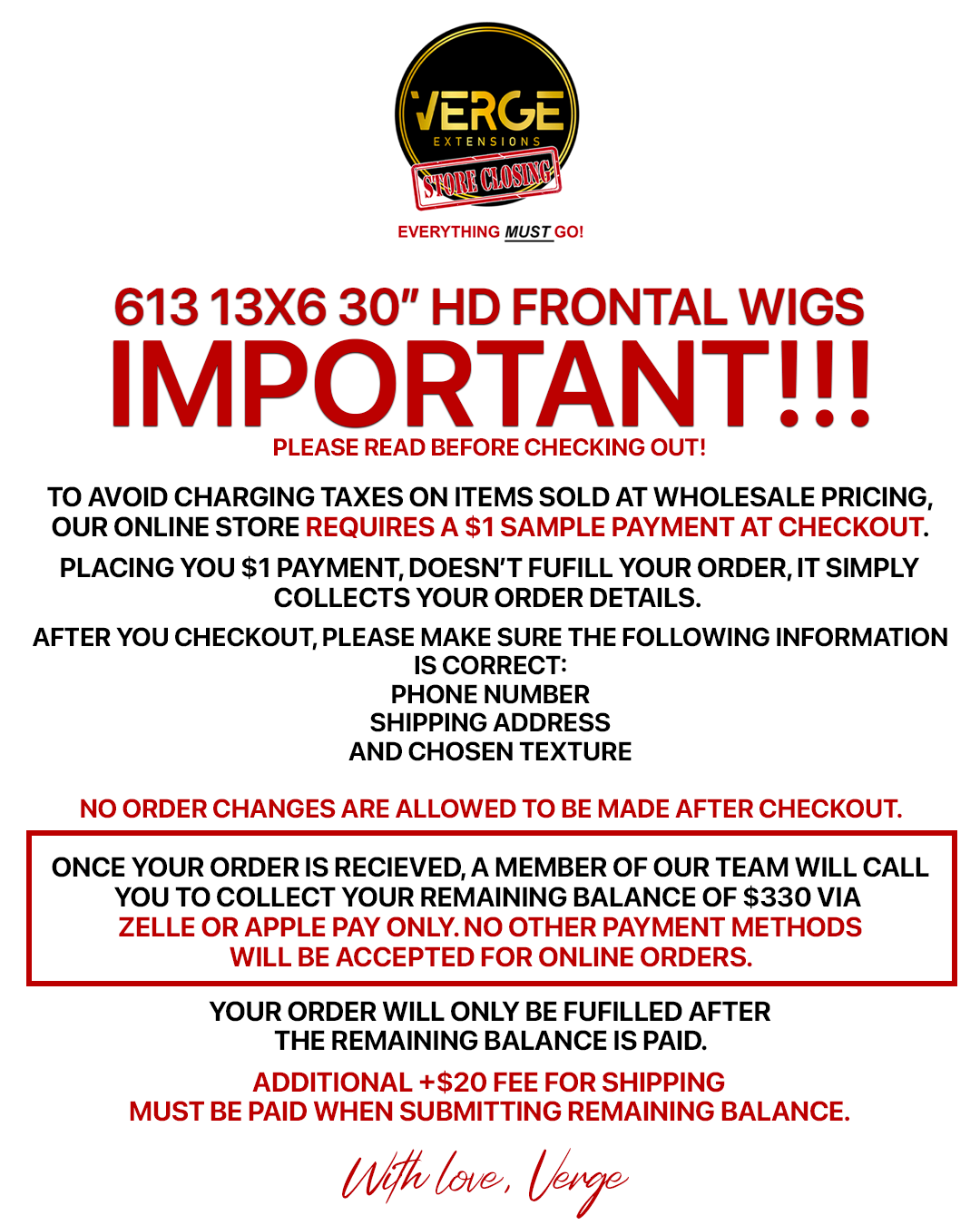 Our 613 13x6 30" HD Frontal WIgs are $517 plus tax. Checking out with product is to only collect your oder details. You will be contacted by our team to make your remaining balance via Zelle & Apple Pay.